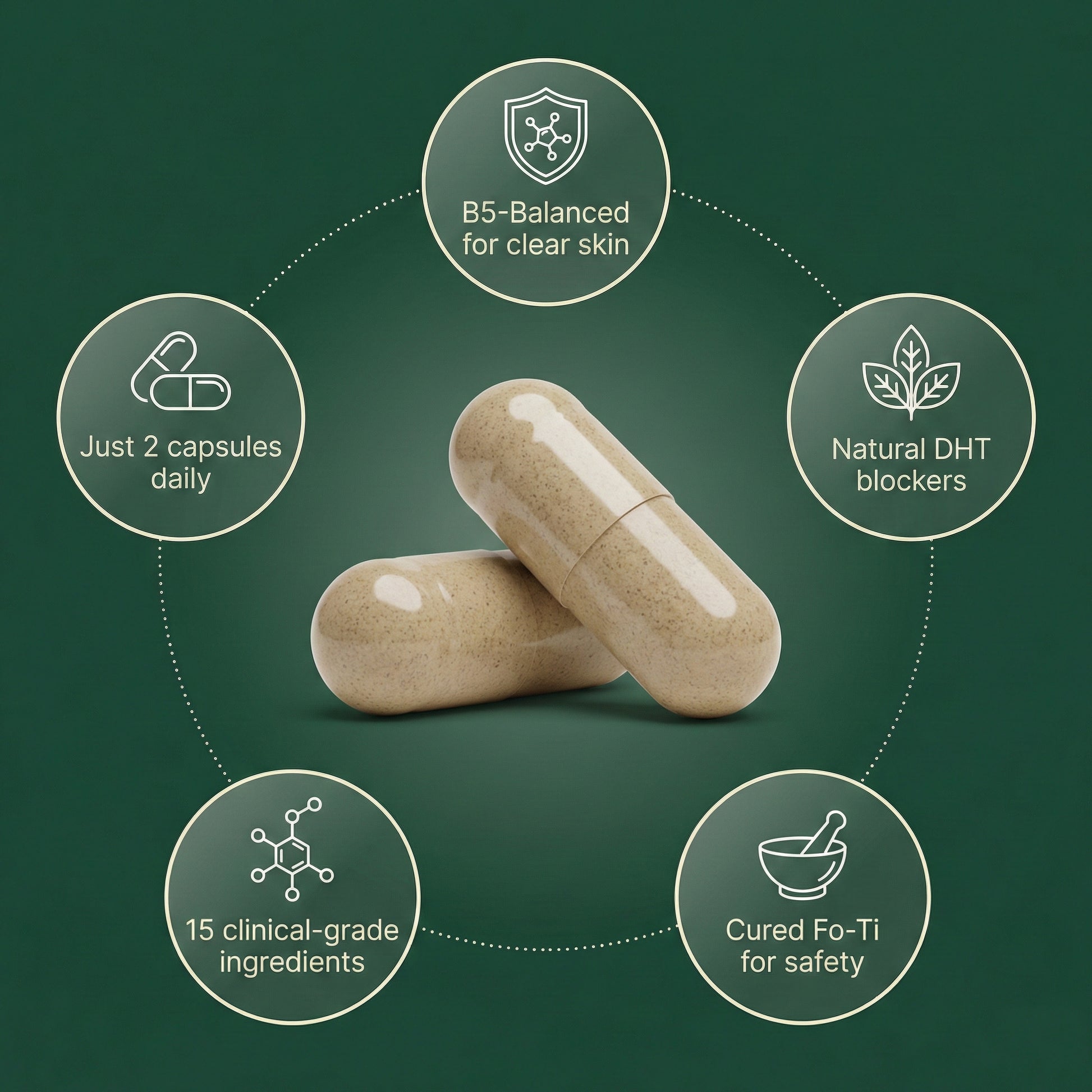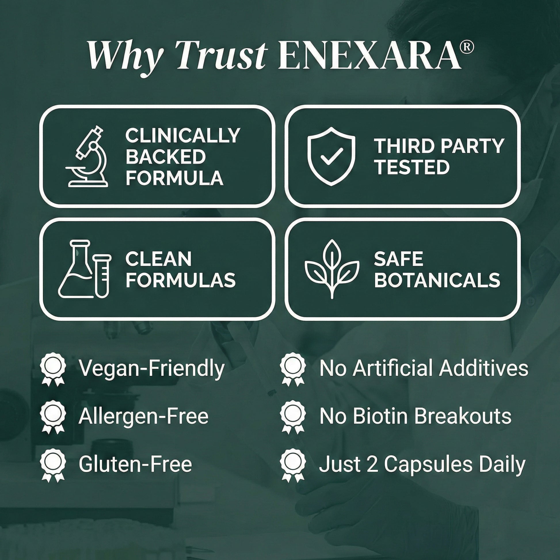 By combining high-potency biotin, B5 shield, and a clinically proven herbal blend, Enexara targets hair growth from within. It saves you time, effort, and money by providing a complete, effective solution without the hassle of multiple supplements or side effects.